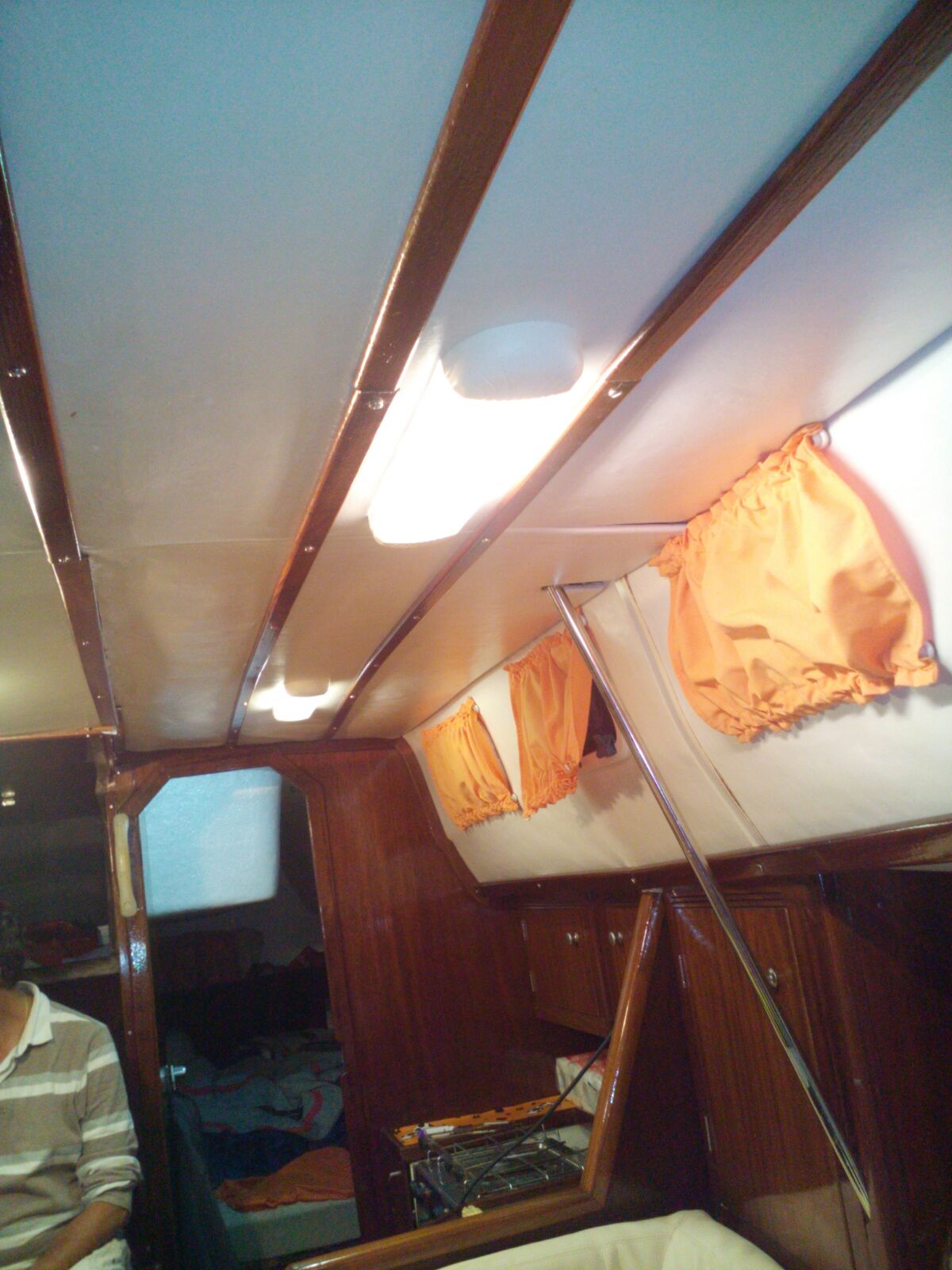 El jueves seguimos con la misma dinámica con alguna sorpresa. Por ejemplo, la bomba de achique, sin instalar, nos descubre por qué: no cabe de forma alguna en la sentina del barco. La hemos dejado montada, con una conexión eléctrica externa y un tubo de achique provisional. Por la tarde, aburridos, nos ponemos a revisar la línea eléctrica que alimenta la iluminación del salón. Tiene tres placas con dos mini fluorescentes cada una pero no se enciende ninguno. Pepón me dice que desmontemos el techo porque el problema está en el cable o en alguna conexión. Antes, obviamente, habíamos intentado ponerlas a funcionar sin acometer ese trabajazo. A Paco casi le da un infarto al ver la osadía que tenemos al quitar el techo, pero bajo la dirección de nuestro Capi, conectamos como es debido las luces y reinstalamos de nuevo ese techo mejorando en lo posible, dados los medios con los que contamos, su presencia. Las siguientes fotos ilustran ese proceso.